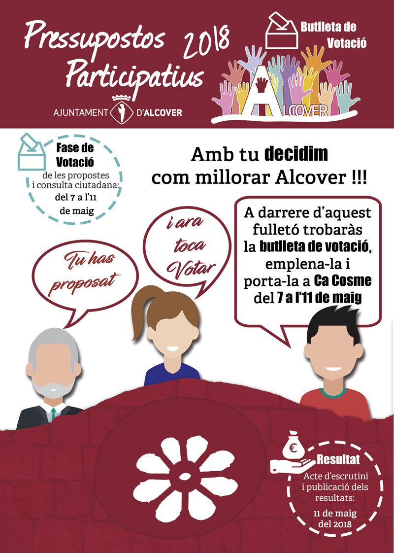 L’Ajuntament d’Alcover ha impulsat els pressupostos participatius, un mecanisme de participació i gestió del municipi, mitjançant el qual els ciutadans/es poden decidir de forma directa sobre la destinació de part dels recursos municipals. Els veïns i veïnes d’Alcover han exposat i proposat en què destinarien 15.000€ del pressupost municipal per executar projectes de millora i manteniment de l’espai públic. S’han presentat un total 26 propostes de les quals, 17 han estat admeses segons els criteris de les bases.